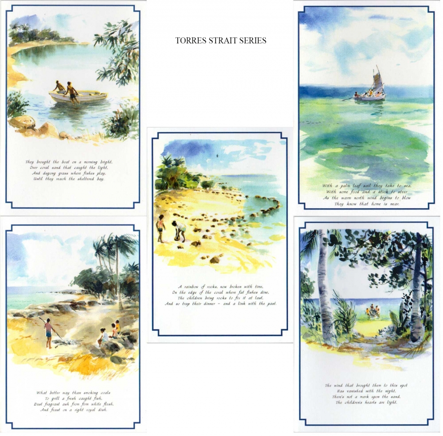 Ron Edwards spent a lot of time in the Torres Straits researching for many of his books on Torres Strait Island culture. Always with sketch pad and pen or water colours in hand, spare time was spent sketching and painting the unique community and environment of the Far North. These images are from his children's book Unexpected Holiday, which is set in the Torres Strait. Ron's superb handling of the medium of water colour painting is obvious in these lovely images, as is his talent at putting words to the scenes, with short poems.